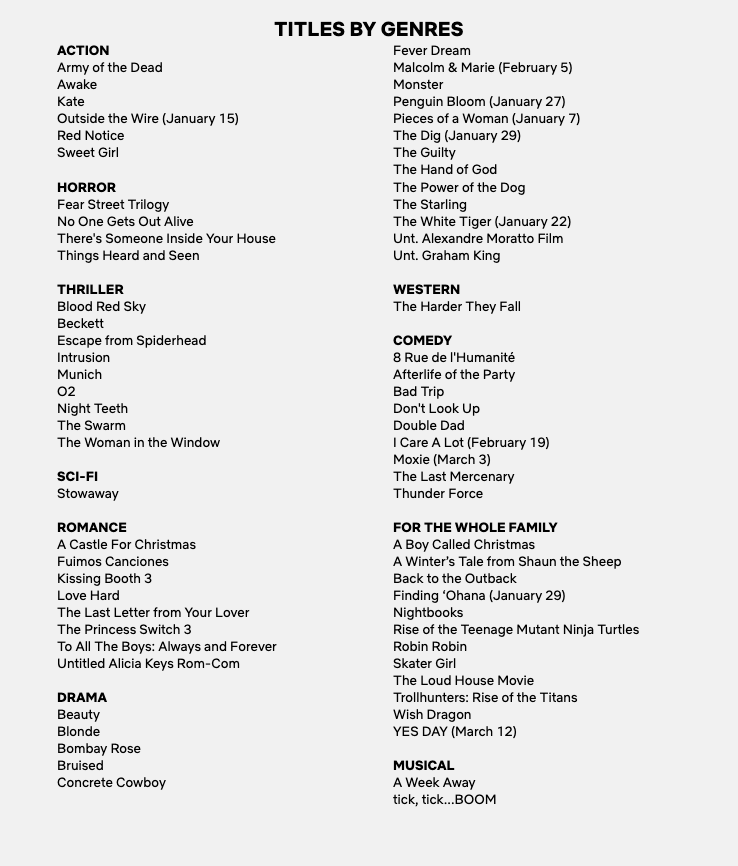 Erik Davis On Twitter And Here Is A List Of Every 2021 Netflix Film As Of Now Separated Out By Genre W Release Dates Where Available Looks Like The 2021 Slate Will